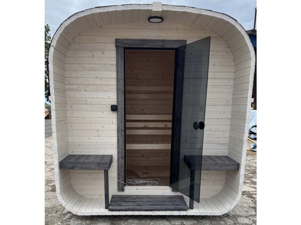 Venkovní sudová sauna na dřevo nebo elektřinu LUXO 240x220 pro 4-6 osob